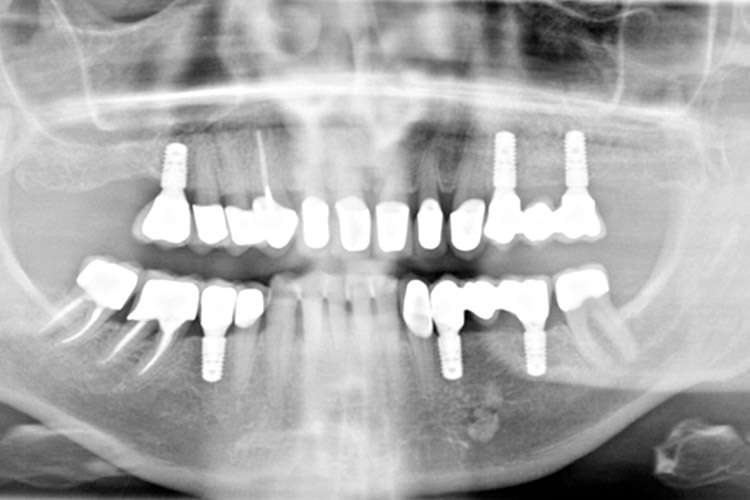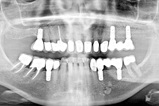 Röntgenbild von Implantaten und festsitzendem ZahnersatzDie Therapie mit Implantaten ist ein in der Zahnmedizin ein nicht mehr weg zu denkender Fortschritt. Seit über 60 Jahren ist „Osseointegration“, der Verbund von Knochen mit Zahnimplantaten aus Titan, bekannt und wissenschaftlich beschrieben. Implantate können in allen Regionen des Ober- und Unterkiefers eingesetzt werden. Dabei besteht die Möglichkeit einzelne Zähne, festsitzende Brücken oder auch herausnehmbaren Zahnersatz auf Implantaten abzustützen. Entscheidend für den Erfolg ist dabei maßgeblich das Behandlungskonzept. Durch wissenschaftliche Fachgesellschaften, z.B. das ITI (International Team for Implantology)